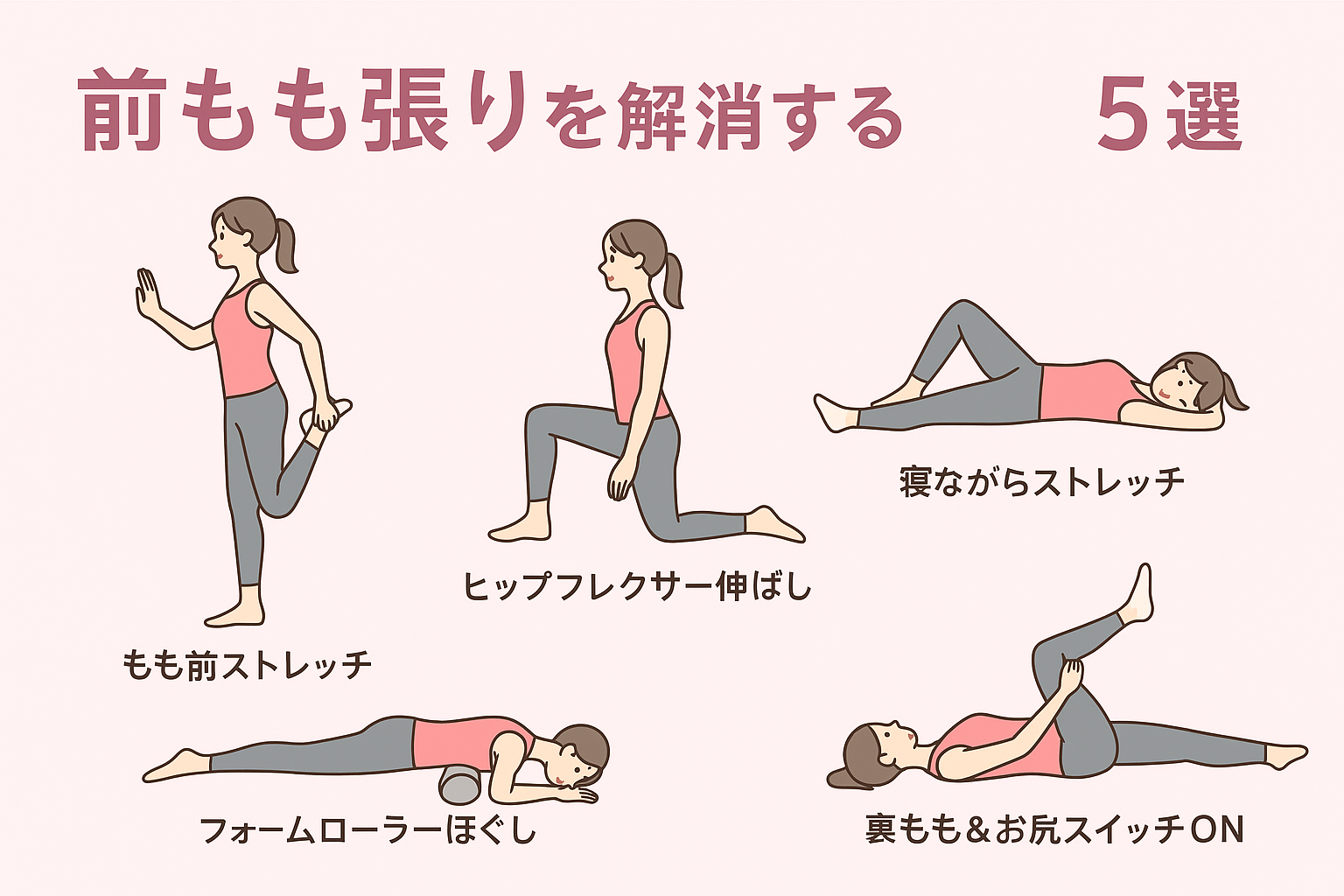 健康・美容 💗前もも張りを解消するストレッチ5選(イラスト付き)|脚痩せしたい人必見!