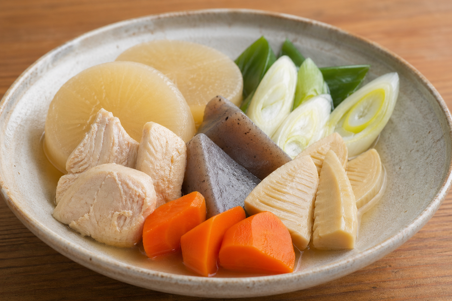 だいこん:消化を助け、胃腸にやさしい こんにゃく:低カロリーで食物繊維が豊富 長ねぎ:体を温め、冷え対策に◎ たけのこ:歯ごたえがあり満足感アップ にんじん:彩りと栄養バランスをプラス